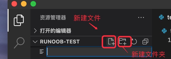 然后我们创建一个 test.py 文件,点击下面新建文件图标,输入文件名 test.py: