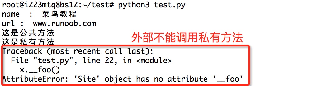 __private_method:两个下划线开头,声明该方法为私有方法,只能在类的内部调用 ,不能在类的外部调用。self.__private_methods。