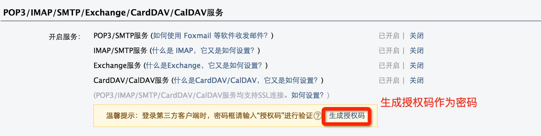 QQ 邮箱通过生成授权码来设置密码: